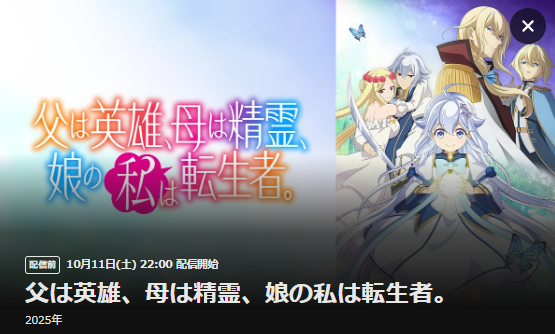 @hononeruransuba皆さん古戦場はどうお過ごしですか? お供にクソアニメなんて如何です? 父は英雄、母は精霊、娘の私は転生者。 配信中!#dアニメストア animestore.docomo.ne.jp/animestore/ci?…