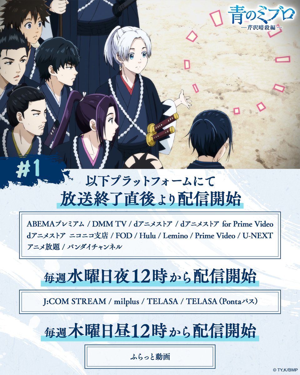 @koto_okaimono青のミブロー芹沢暗殺編ー、いよいよ始まる!幕末の熱い若者たちの話で、内部の正義がぶつかり合う暗殺劇とか絶対面白い!梅田修一朗さん、小林千晃さん、阿座上洋平さんが出るの楽しみすぎる! 堀江瞬 小野賢章 竹内良太 杉田智和