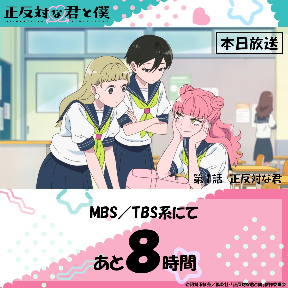 アニメ『正反対な君と僕』第9話の放送時間が変更に 配信時間も要注意 …方17時よりMBS/TBS系全国28局ネットにて放送中のTVアニメ『正反対な君と僕』の放送時間の変更が発表されました。 阿賀沢紅茶先生による同題マン… (出典:マグミクス) |