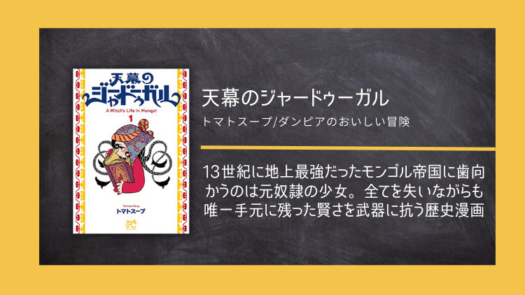 @mikawa_ky返信先:@mmmo___3 天幕のジャードゥーガルがおすすめです。 モンゴル人に村を焼かれた女の子が復讐のために恭順したふりをして潜り込み、モンゴル帝国の世界征服を手助けしながら内部から瓦解させようと画策する戦記モノです。 絵柄が尖ってるので人を選ぶんですがストーリーの組み立て方がものすごく上手くて良作です pic.x.com/VjVvJ2WWGQ